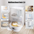 The Multifunctional Dock 2.0 auto-empties the dustbin, refills the water tank, washes the mop with hot water (up to ~140 °F), and warm-air dries for a fully autonomous cleaning cycle.